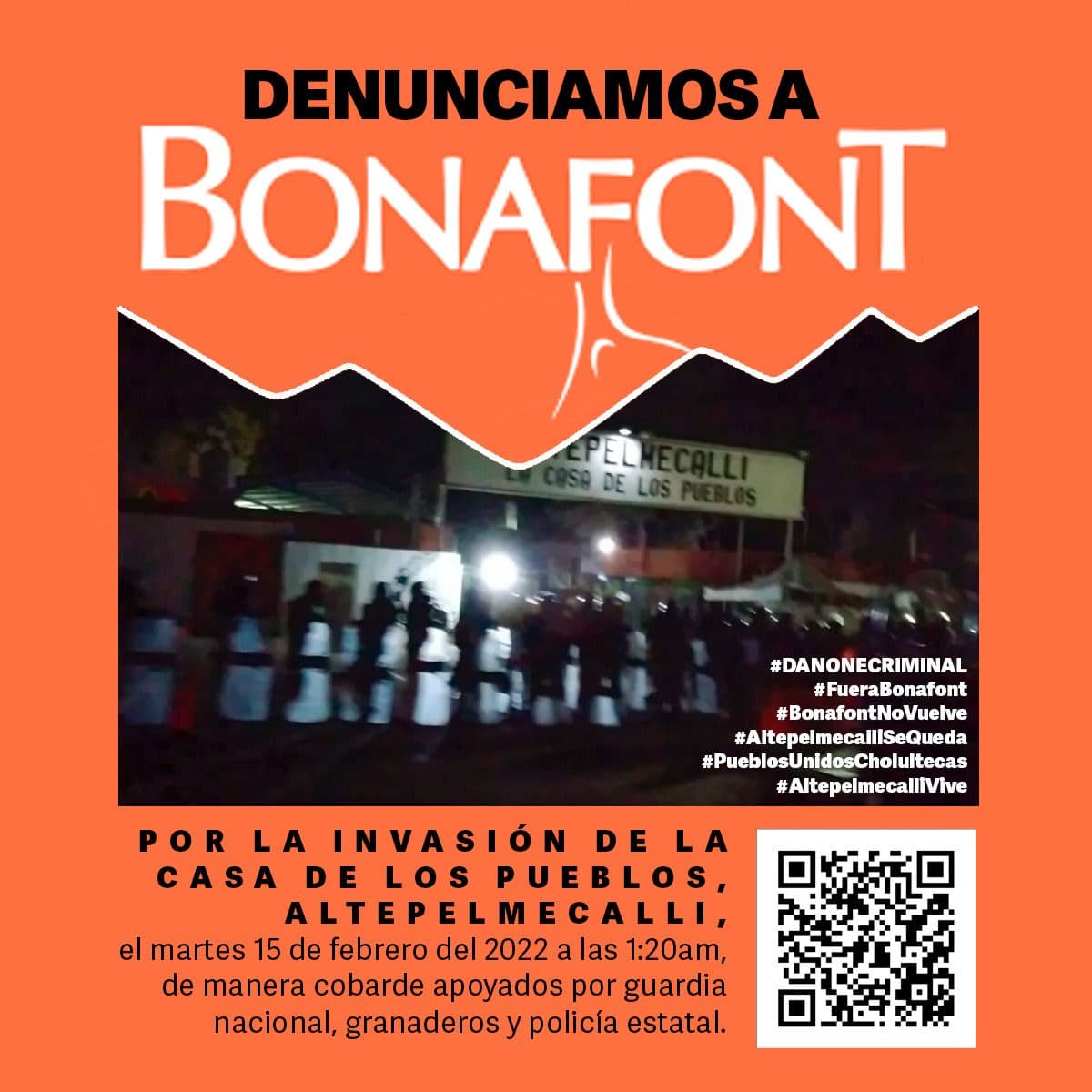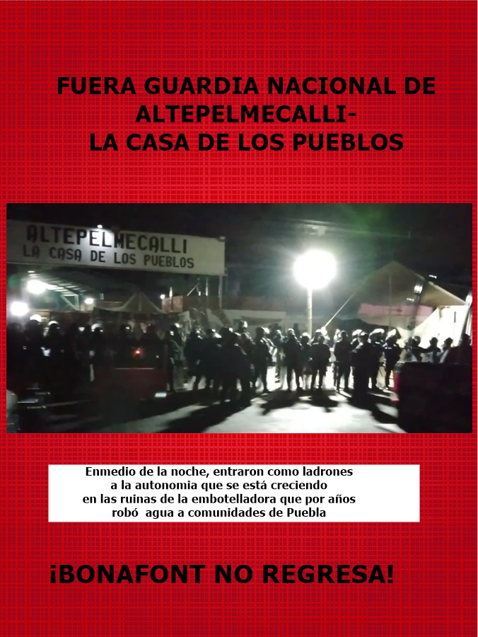 Hoy, 15 de febrero del 2022, el presidente de México, Andrés Manuel López Obrador, el gobernador de Puebla, Luis Miguel Barbosa Huerta y el presidente municipal de Juan C. Bonilla, José Cinto Bernal, se coordinaron para defender a la empresa Bonafont del corporativo DANONE, despojar a los pueblos de su agua y violentar la autodeterminación de las comunidades originarias de la Región Cholulteca. Con un megaoperativo con elementos de la Guardia Nacional, del cuerpo de granaderos, de la policía estatal y de la policía municipal orquestaron la entrada por la fuerza a las instalaciones de Altepelmecalli, la Casa de los Pueblos, bastión de la organización en defensa del agua a nivel nacional e internacional.