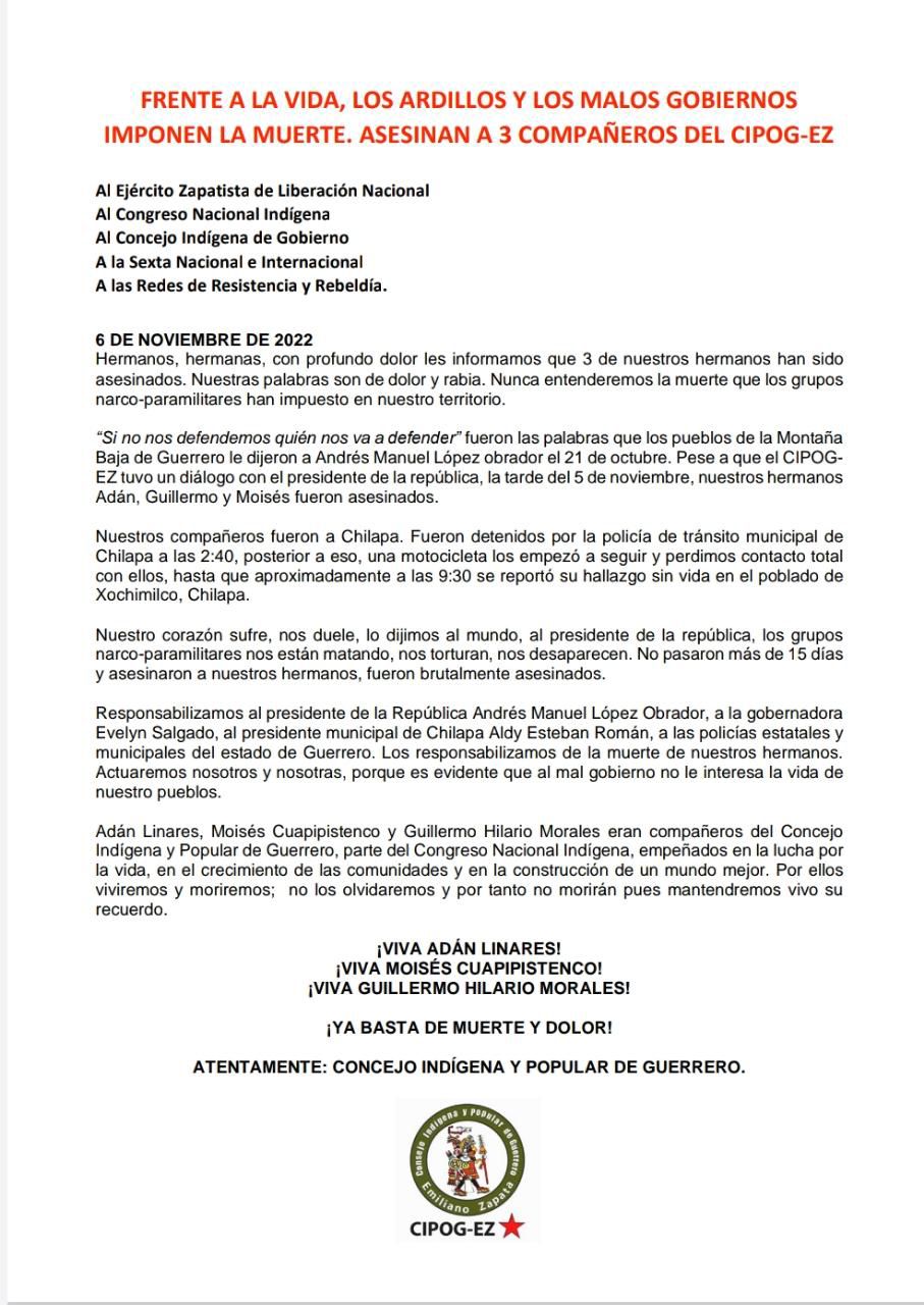 Adán Linares, Moisés Cuapipistenco y Guillermo Hilario Morales eran compañeros del Concejo Indígena y Popular de Guerrero, parte del Congreso Nacional Indígena, empeñados en la lucha por la vida, en el crecimiento de las comunidades y en la construcción de un mundo mejor. Por ellos viviremos y moriremos; no los olvidaremos y por tanto no morirán pues mantendremos vivo su recuerdo.