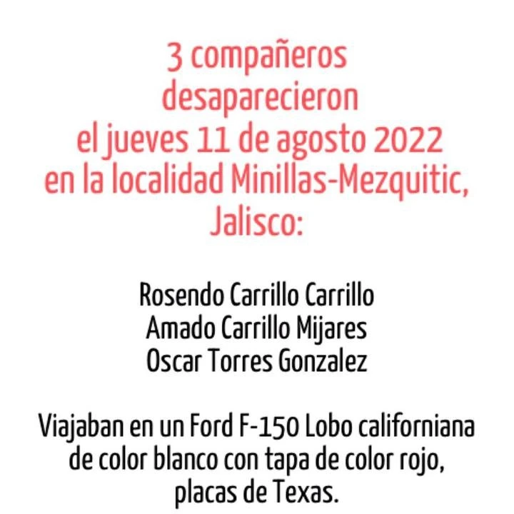Donde denunciamos los hechos que ocurrieron en el lugar denominado Minillas, Mezquitic el día jueves 11 de agosto de 2022 a las 6:30 AM, se desaparecieron 3 compañeros de nombres: ROSENDO CARRILLO CARRILLO con edad de 52 años, AMADO CARRILLO MINJARES con 11 años de edad hijo de Rosendo, OSCAR TORRES GONZÁLEZ con edad de 37 años, donde viajaban en un vehículo FORD F-150 Lobo californiana de color blanco con tapa de color rojo, placas de Texas.