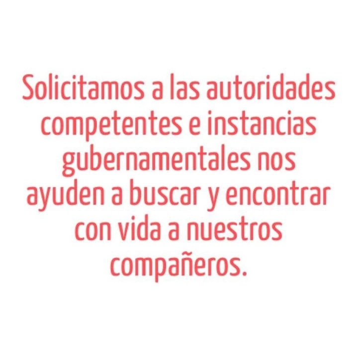 Solicitamos, demandamos, exigimos a que liberen rescaten sanos y vivos a los compañeros extraviados, que lleguen con vida, le solicitamos a las autoridades competentes, instancias gubernamentales que nuestra petición, manifestación sea atendida lo más pronto posible.