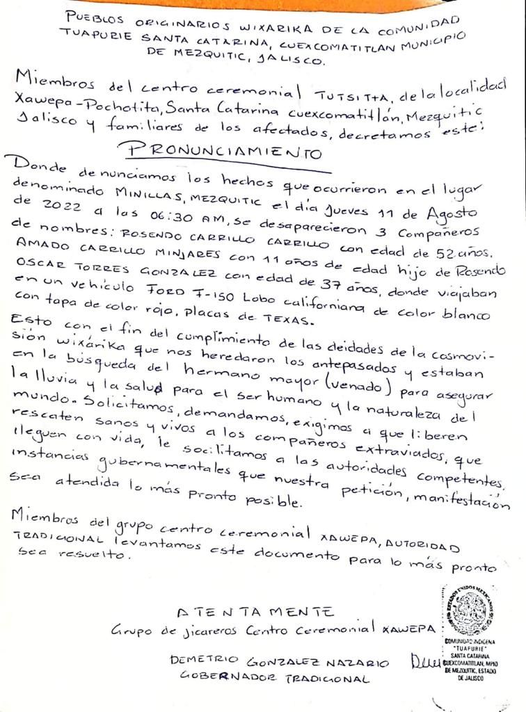 Miembros del Centro Ceremonial Tutsita, de la localidad Xawepa-Pochotita, Santa Catarina Cuexcomatitlán, Mezquitic, Jalisco y familiares de los afectados, decretamos este
